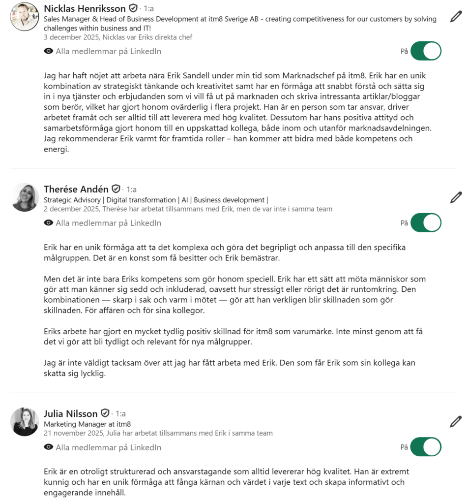 Min contentproduktion spänner över två decennier och många intressanta ämnen. Jag har lärt mig massor om AI, cybersäkerhet, digital transformation och EU-regleringar – för att inte tala om affärssystem, molntjänster och betallösningar. Den röda tråden är B2B tech, men jag har också skrivit om medarbetare, psykologi, hjärnvetenskap och ledarskap.